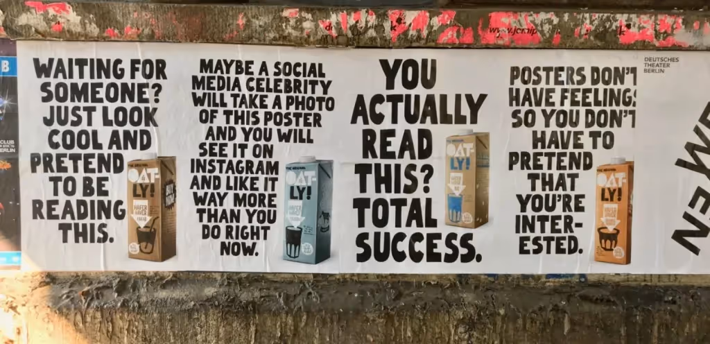 The Oatly marketing campaign is characterised by its clever and irreverent approach. Rather than relying on traditional advertising methods, Oatly took a bold and unconventional approach that resonated with consumers. Their marketing materials are filled with witty and humorous messages that challenge conventional dairy industry norms and invite consumers to question their choices.