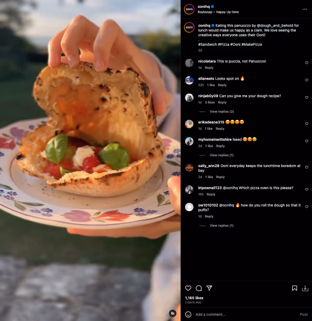 Furthermore, Ooni understands the importance of engagement on Instagram. They utilise strategic hashtags to increase their discoverability and actively engage with their followers by responding to comments and messages. This two-way communication not only strengthens the bond between Ooni and their customers but also encourages user-generated content, with fans sharing their own pizza creations using Ooni's products.Through these efforts, Ooni has managed to build a passionate community of pizza lovers on Instagram, with their brand becoming synonymous with delicious homemade pizzas.