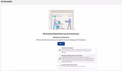 Now it’s time to create your ad account. To do this you need to go to ‘accounts’ in ‘business settings’ and choose ‘ad accounts’ Here you will have 3 options: ‘Add an ad account’, ‘request access to an ad account’ and ‘create a new ad account.’ Simply select ‘create a new ad account.’