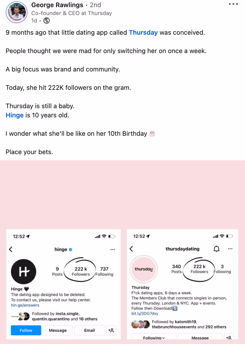 What’s HOT?!?! This section of the newsletter showcases brands and businesses doing something innovative in their space. It’s a bit of a different one for us this week. Dating apps, there is a lot of choice when it comes to picking the right app, it’s a bit like picking the right date, right? With big players dominating the market including the likes of Tinder, Bumble and Hinge, it would take a bold challenger to try and steal a slice of the action. What was unexpected, was that this challenger would be out of action for 85.7% of the time putting the act of playing hard to get, like many of its users, into practice.Enter Thursday, an app that aims to connect people in person only on a Thursday. With this unique model of only being turned on on Thursday and only allowing users to talk and meet on this day too, how has Thursday managed to make noise in such a cluttered market? According to their founders, they are putting the thrill back in dating by claiming a whole day for dating. Well firstly, their identifiable millennial pink is everywhere making them hard to miss. But what really makes them stand out from their competitors is that they have honed in on their USPs. Re-imagining the dating app, they focus on offline experiences via online connections and regard themselves as a ‘singles member’s club’ allowing for community to take a big focus in their marketing activity - after our newsletter on community management (catch up here), we know how important this is. In an act to keep community at the heart of its activity, as well as assert themselves in the market, they have deployed an event led model enhanced by brand partnerships, in conjunction with guerilla style campaigns. Whether the campaigns are OOH (as you can see below) or on employee engagement on LinkedIn, their controversial yet light hearted opinions invite engagement from followers and generate buzz from users, employers and onlookers alike. A big take away that we have from Thursday’s approach is not only the importance of having a unique and identifiable TOV in a cluttered market which may ruffle some feathers, but also ensuring that your employees act as brand advocates who are extensions of this voice. They can be a really valuable tool to include in your marketing strategy.