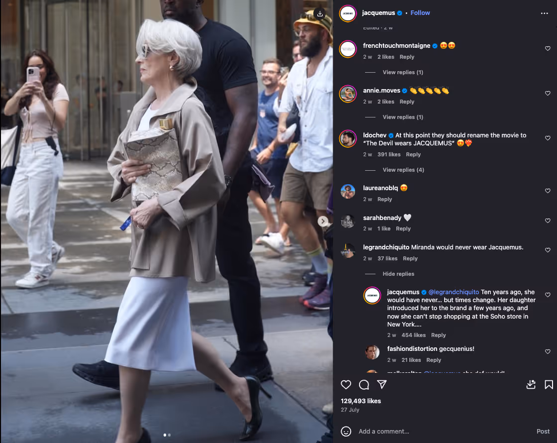 For Jacquemus, a witty, in-character reply to a comment doubting whether Miranda Priestly (in the upcoming Devil Wears Prada sequel) would carry their bag - complete with a backstory about her daughter introducing her to the Soho store - cleverly blends brand storytelling with pop culture.