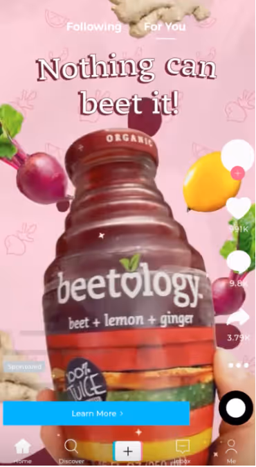 TikTok in-feed ads are videos that you can create to promote your brand and products. They look a lot like regular posts on TikTok, except for the fact that they contain a "Sponsored" label across the top of the video with a link to your business's website. Users can like, comment, and share your ad like they would a normal video.To get started with this type of ad, you'll first need to choose the products or services you want to promote. Next, create a short video up to 60 seconds (optimal duration: 15 seconds!) long that showcases them.Be sure to include a call to action at the end of your video that encourages viewers to click on the link in your post or visit your website. If you don't have any experience making videos on TikTok, we recommend starting with some free templates from Canva or Biteable.Here’s an example and why it worked:Beetology is a premium organic beet juice brand that was looking to increase awareness and reach new consumers on TikTok. The beet juice brand decided to use In-Feed video ads to reach the platform’s health-conscious audience of Gen Z and Millennial users.Their strategy was simple: create a video that was engaging and fast-paced, showcasing smooth transitions between user-generated content (UGC) and brand elements.